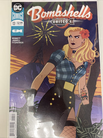 "Bombshells United #13" from DC Comics, published in early May 2018, features a superhero ensemble including characters like Batgirl, Bumblebee, Black Canary, and Killer Croc in cameo appearances. Written by Marguerite Bennett with art by Sandy Jarrell and Kelly Fitzpatrick, the unit type is a single issue comic book. The cover art is done by Kelly Fitzpatrick and Sandy Jarrell, showcasing the modern age superheroes in a vibrant style. This collectible comic is part of the Bombshells United series, known for its unique take on familiar characters in a World War II setting.