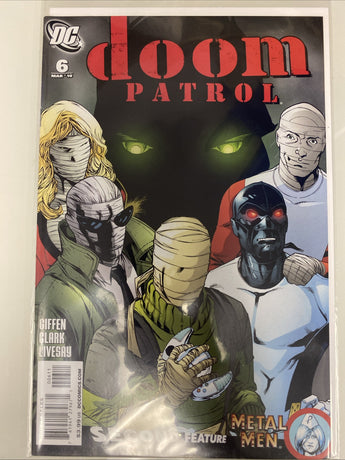 The product is a comic book titled "Doom Patrol #6" published by DC Comics in March 2010. The comic features characters such as Negative Man, Doc Magnus, Elasti-Woman, and Martian Manhunter in cameo appearances or as part of the superhero team Doom Patrol. The creative team behind this issue includes writers Keith Giffen and J. M. Dematteis, artists John Livesay and Kevin Maguire, and cover artists Guy Major and Matthew Clark. The genre of the comic is superheroes, and it is part of the Modern Age era of US Comics.