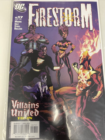 The product is "Firestorm #17" published by DC Comics in November 2005. This comic features characters such as Jason Rusch, Firestorm, Black Adam, and the Royal Flush Gang Ace of Spades. The story involves encounters with characters like Gehenna, Commander Duk'at Falcara, and Parasite, among others. With art by Jamal Igle and writing by Stuart Moore, this issue falls within the Modern Age era of US Comics, offering a superhero genre comic book that is part of the Firestorm series.