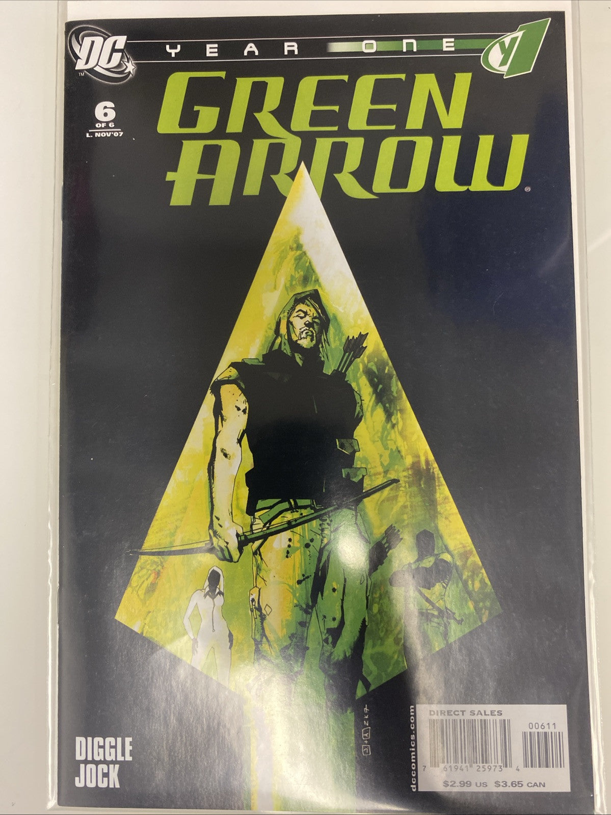 The product is a comic book from DC Comics titled "Green Arrow: Year One #6," published in late November 2007. It features artists and writers David Baron, Jock, and Andy Diggle, focusing on characters like Green Arrow (Oliver Queen), China White (Chien Na Wei), Mr. Hackett, and Taiana. The issue introduces China White's baby, Tupu Tamaitai, and Mr. Hackett's demise. With a cover art by Jock, the comic falls under the Superheroes genre in the Modern Age era of US Comics. The storyline is in English and is part of a series exploring Green Arrow's early years.