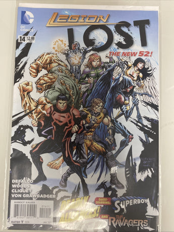 The product is "Legion Lost #14," a comic book published by DC Comics in January 2013. It features a variety of characters including Chameleon Girl, Red Robin, Superboy, and members of the Legion of Super-Heroes. The artwork is done by artists such as Marc Deering, Scott Hanna, and Pete Woods, with a cover by Tyler Kirkham, Wes Hartman, and Matt Banning. This issue falls within the Modern Age era of comics and is part of the superhero genre, specifically focusing on the Legion of Superheroes team.