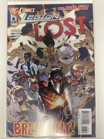 The product is "Legion Lost #6," a comic book published by DC Comics in April 2012. It features characters like Wildfire, Chameleon Girl, Major Nicholson, Tellus, and others from the Legion of Superheroes team. The creative team includes writers Matt Camp and Fabian Nicieza, artists Pete Woods and Brad Anderson, and cover artists Pete Woods and Brad Anderson. This issue falls within the Modern Age era of comics and is part of the Legion Lost series, showcasing superhero action in the English language.