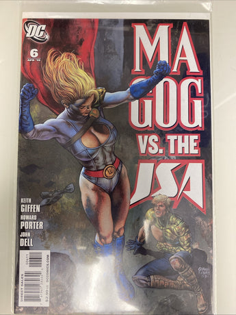This vintage single issue comic book from 2010 features the superhero Magog facing off against the Justice Society of America. Illustrated by Howard Porter and Kieth Giffen, with cover art by Glenn Fabry, it belongs to the "Magog" series within the DC Universe. This color comic is a first edition, boarded and suitable for a general audience interested in superheroes from the Modern Age era of comics.