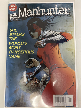 The product is a signed comic book titled "Manhunter #1" by Jimmy Palmiotti, featuring the character Manhunter. Published by DC Comics in English, this is a single unit softcover issue in color. The comic belongs to the Manhunter series in the Modern Age era and is part of a monthly publication frequency. As it is signed by the artist/writer, Jimmy Palmiotti, this comic holds a unique collectible value for fans of US comics and the character Manhunter.