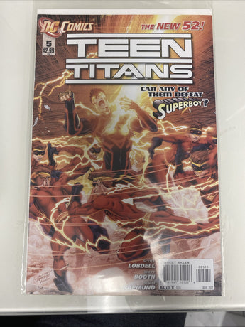 The product is "Teen Titans #5 (DC Comics March 2012) Box 2," a comic book featuring artists and writers such as Scott Lobdell, Norm Rapmund, Andrew Dalhouse, and Brett Booth. The issue focuses on characters like Kid Flash (Bart Allen), Red Robin (Tim Drake), Wonder Girl (Cassie Sandsmark), and Superboy as part of the Teen Titans superhero team. Published by DC Comics in 2012, the comic belongs to the Modern Age era and is written in English, targeted at collectors and fans of superhero comics.