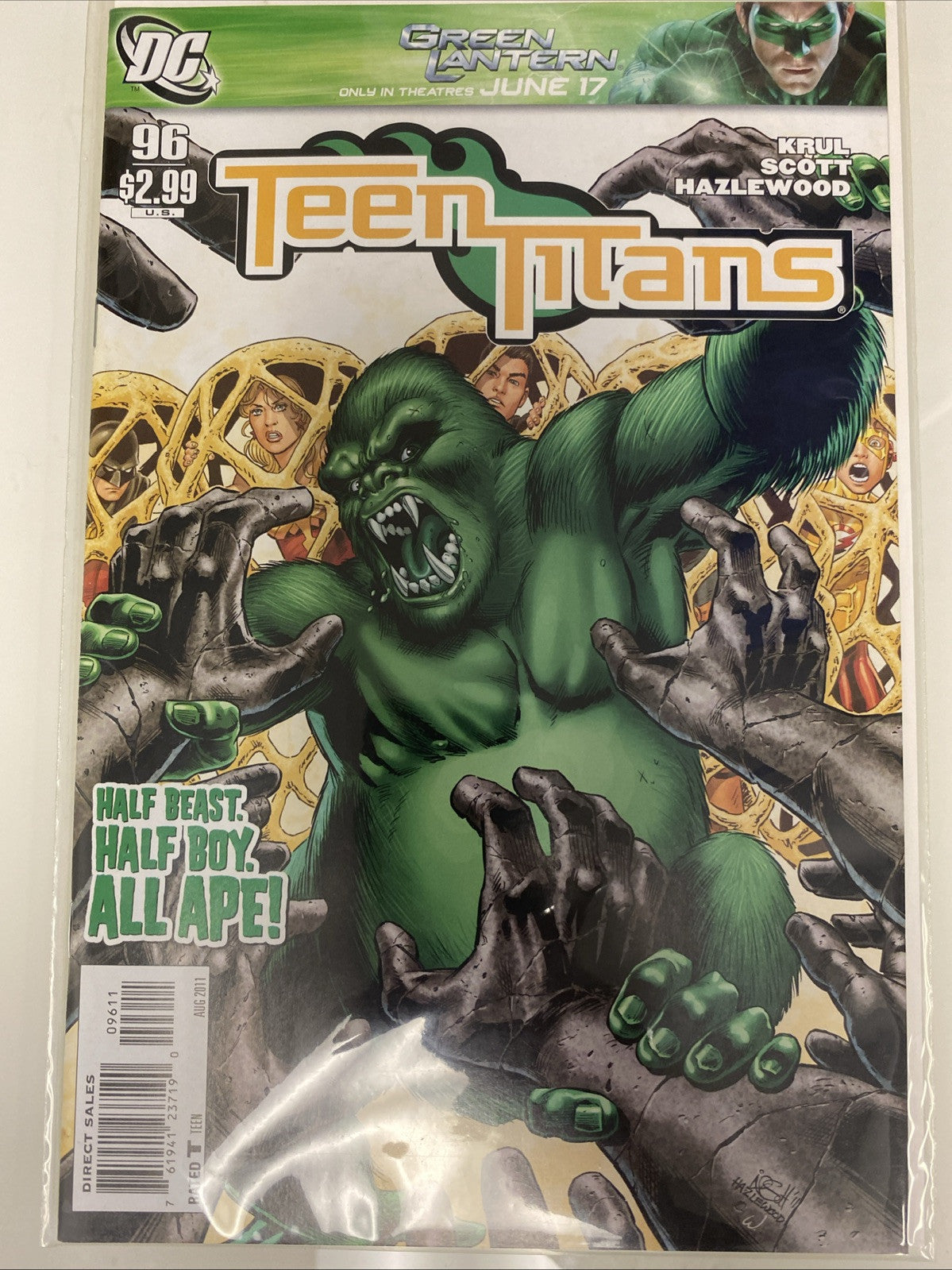 The product is a comic book titled "Teen Titans #96" published by DC Comics in August 2011. It features characters like Tim Drake, Kid Flash, Wonder Girl, and Superboy as part of the Teen Titans superhero team. The cover artists include Doug Hazlewood, Jason Wright, and Nicola Scott, with writers such as Jonas Trindade and Sandro Ribeiro contributing to the series. The comic is part of the modern age era of US Comics and is written in English, focusing on superheroes and targeted towards collectors and fans of the Teen Titans franchise.