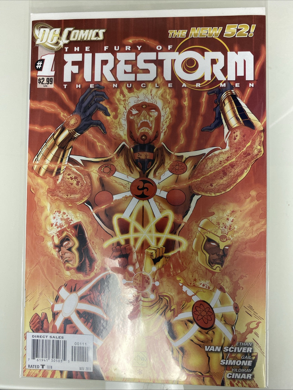 The product is "The Fury of Firestorm: The Nuclear Men #1" comic book published by DC Comics in November 2011. This issue features artists and writers such as Ethan Van Sciver, Gail Simone, Yıldıray Çınar, and Steve Buccellato, focusing on characters like Jason Rusch, Firestorm, and Fury Ronnie Raymond. The cover art is done by Ethan Van Sciver and Hi-Fi, catering to fans of superheroes in the Modern Age era of US comics.