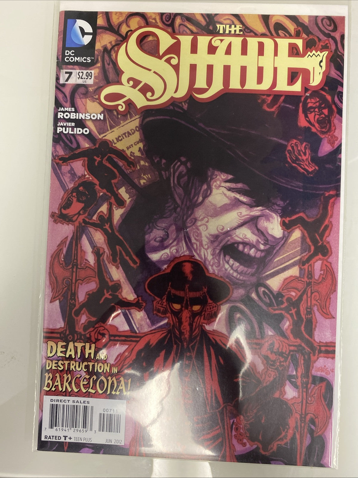"The Shade #7" is a comic book published by DC Comics in June 2012 as part of the series focusing on the character Shade (Richard Swift). The issue features artists and writers Hilary Sycamore, James Robinson, and Javier Pulido, with a cover art by Tony Harris. The story unfolds in the Modern Age era of US Comics and includes characters like Montpellier, La Sangre, Inquisitor, and Shade. This collectible comic book is in English and belongs to the superhero genre, making it a valuable addition for fans and collectors of comics and graphic novels.