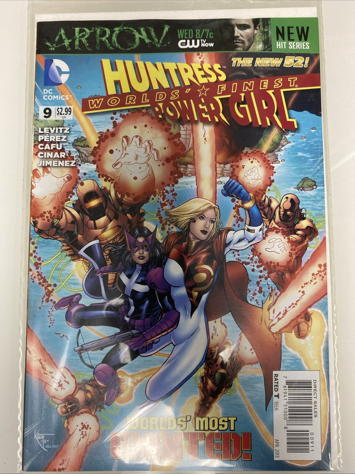 The product is "World's Finest #9" published by DC Comics in April 2013. This comic features a superhero genre with characters like Power Girl Kara Zor-L and Huntress (Helena Wayne). The artists involved include George Pérez, Cafu, and Paul Levitz, among others, contributing to the modern age era of US Comics. The cover artwork is by Barry Kitson and Blond. This collectible comic book is a part of the World's Finest series, showcasing the adventures of the iconic superheroes within the DC Universe.
